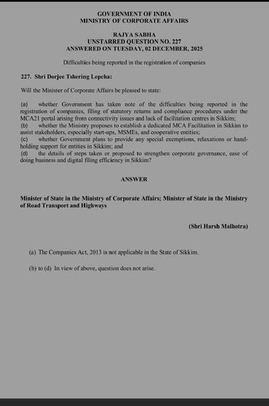 Further, A written reply placed before the Rajya Sabha has finally brought long-awaited clarity on the applicability of the Companies Act, 2013 to the State of Sikkim. In response to a question raised by Dorjee Tshering Lepcha, the Ministry of Corporate Affairs (MCA) categorically confirmed that the Companies Act, 2013 does not extend to Sikkim. The reply, issued by the Hon’ble Minister of State for Corporate Affairs Harsh Malhotra, has significant legal, regulatory, and economic implications for companies, startups, MSMEs, and cooperative entities operating in the State.